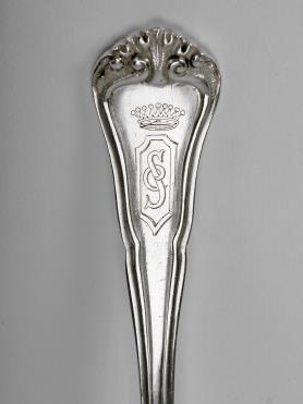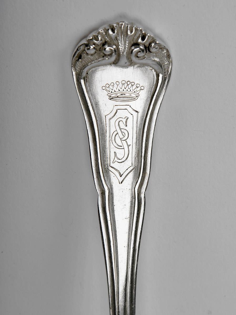 decoração gravada com monograma CS encimado por coronel de conde, composto por 5 talheres de servir, colheres de sopa, talheres de peixe, de carne e de sobremesa e colheres de chá, contraste Javali do Porto (1887-1937), alguns talheres de peixe com marca
