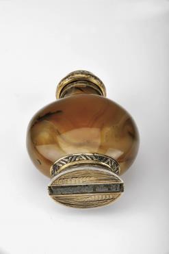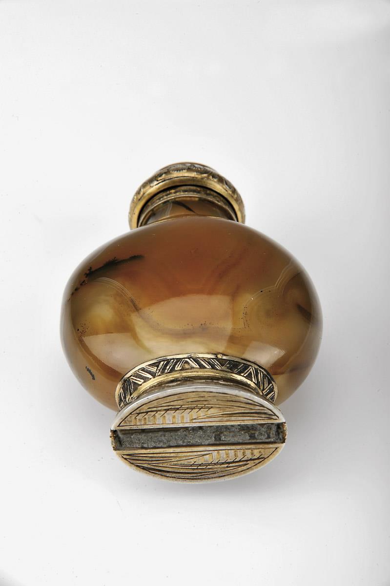 tampa em turmalina rosa e vidro verde, adaptada a isqueiro com aplicações em prata dourada e gravada "Aves" e inscrição "Maquet", marca de garantia de Paris (1838-1961), marca de ourives F.R.