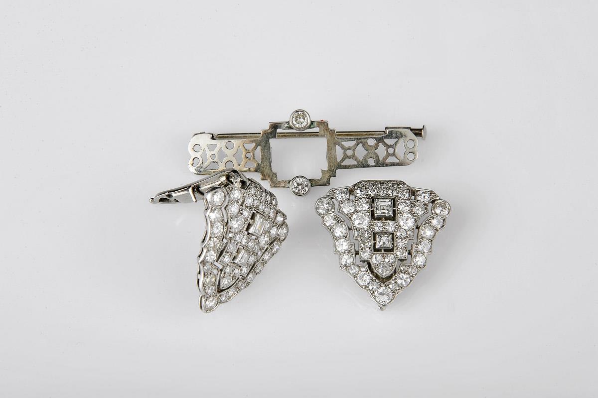 cravejada com 4 diamantes em talhe antigo de baguette com o peso aproximado de de 0,32 ct., 8 em talhe rosa e 94 em talhe de brilhante com o peso aproximado de 4,70 ct., contraste de Lisboa (1938-1984)