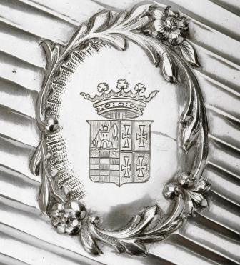 composto por espelho de mão e três escovas, decoração espiralada, cartela com armas de família europeia, contraste Javali do Porto (1887-1937), marcas de ourives de Augusto César Trindade Machado (1887)
