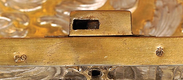 folha de prata relevada e cinzelada com duas passagens do Antigo Testamento "Daniel na cova dos leões" e "Jonas e a baleia" e seis cenas "Figuras e paisagens", contraste de Augsburg, marca de ourives David Iº Schwestermüller