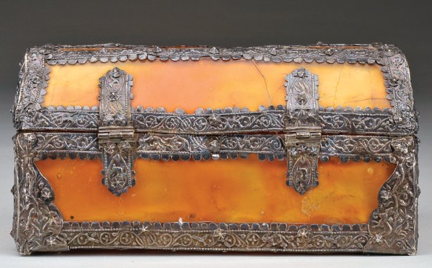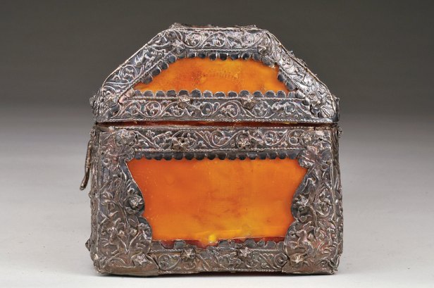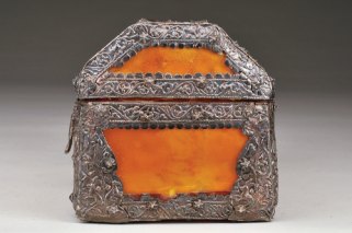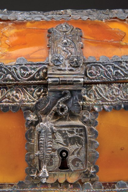 aplicações e fecho em prata lavrada "Coelhos, aves e motivos vegetalistas", fecho de caixa com batente relevado "Salamandra"