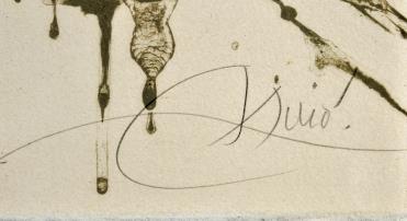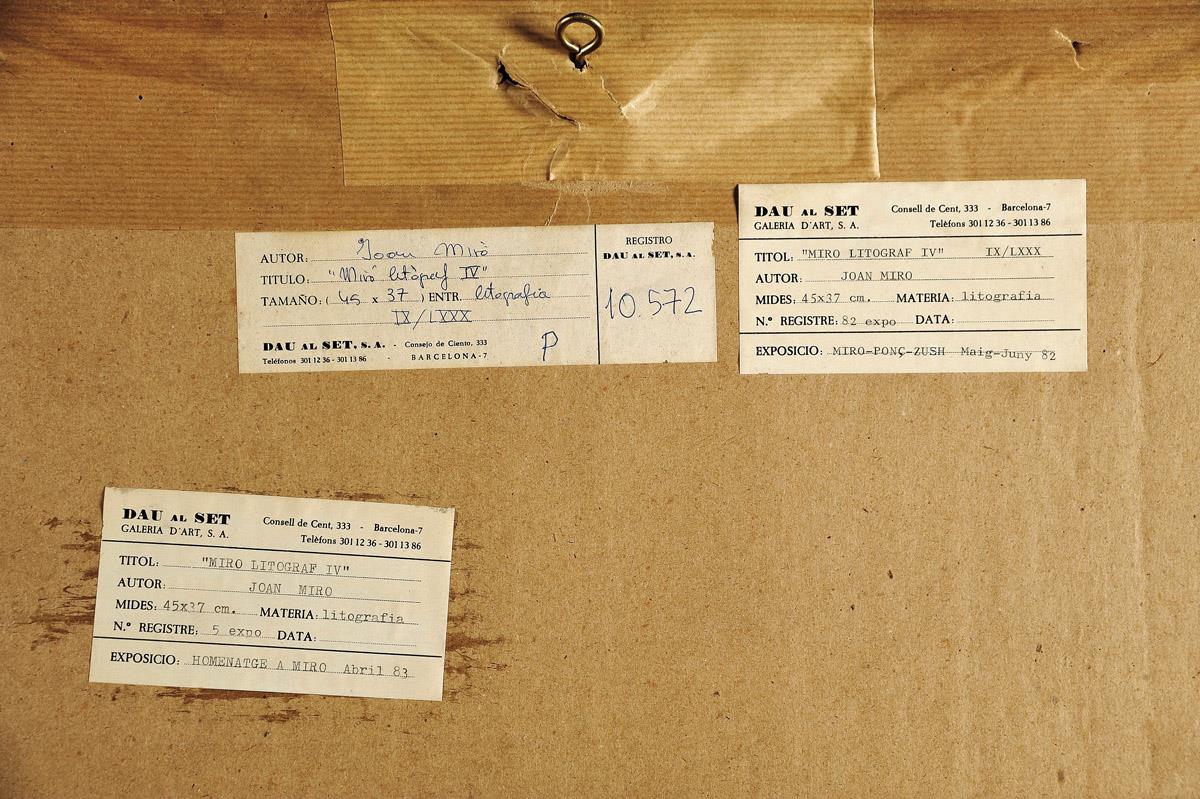 etiquetas coladas no verso da galeria Dau al Set, Barcelona, identificando a obra e indicando as exposições de 1982 e 1983 que a obra foi integrou.