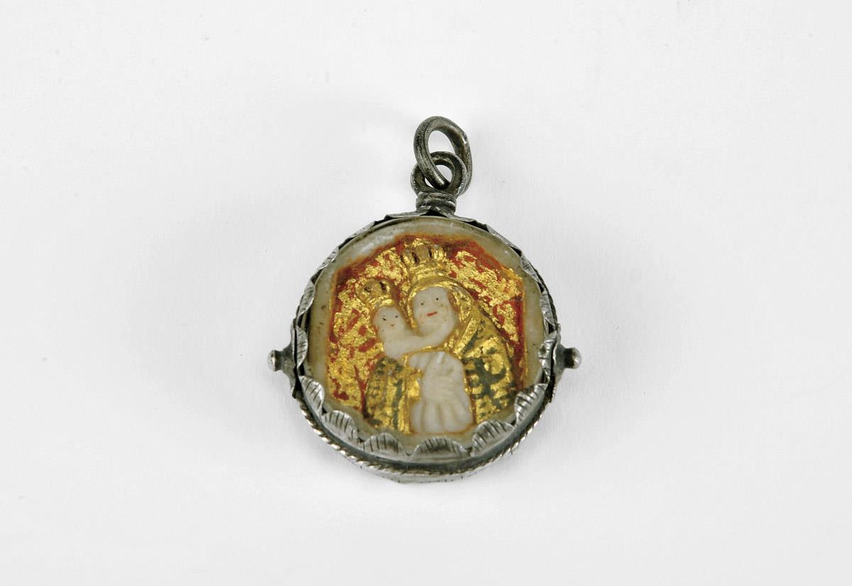 medalhão em alabastro esculpido, policromado e dourado em ambas as faces