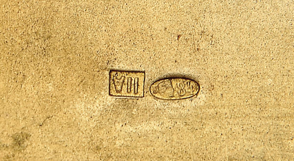 decoração em esmalte cloisonée policromado "Figura feminina fantástica" e "Ave", marca de Moscovo para o teor de 84 zlotnicks (1908-1917), marca da 11ª Artel (Cooperativa especializada em objectos Arte Nova)