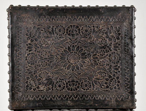 tabela frontal entalhada, pernas e travejamento torneados, assentos em couro lavrado com pregaria