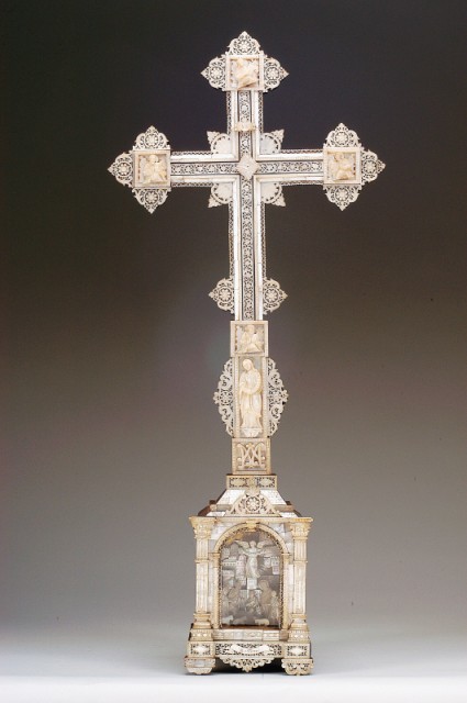parte frontal revestida a madrepérola esculpida, relevada e vazada "Nossa Senhora" e "Quatro Evangelistas", peanha/maquineta tendo no interior "Presépio", esculturas em madrepérola