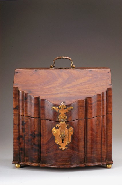 aplicações em cobre dourado, interior com seis colheres de sopa, facas e garfos de resto e colheres de chá, prata, marcas de ensaiador e de ourives diversas