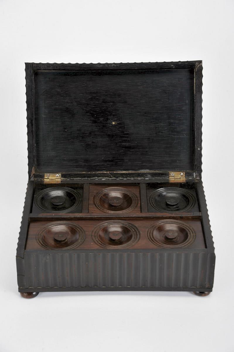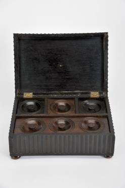 decoração de «tremidos», interior compartimentado com divisórias e receptáculos com tinteiro e areeiro, puxador em bronze