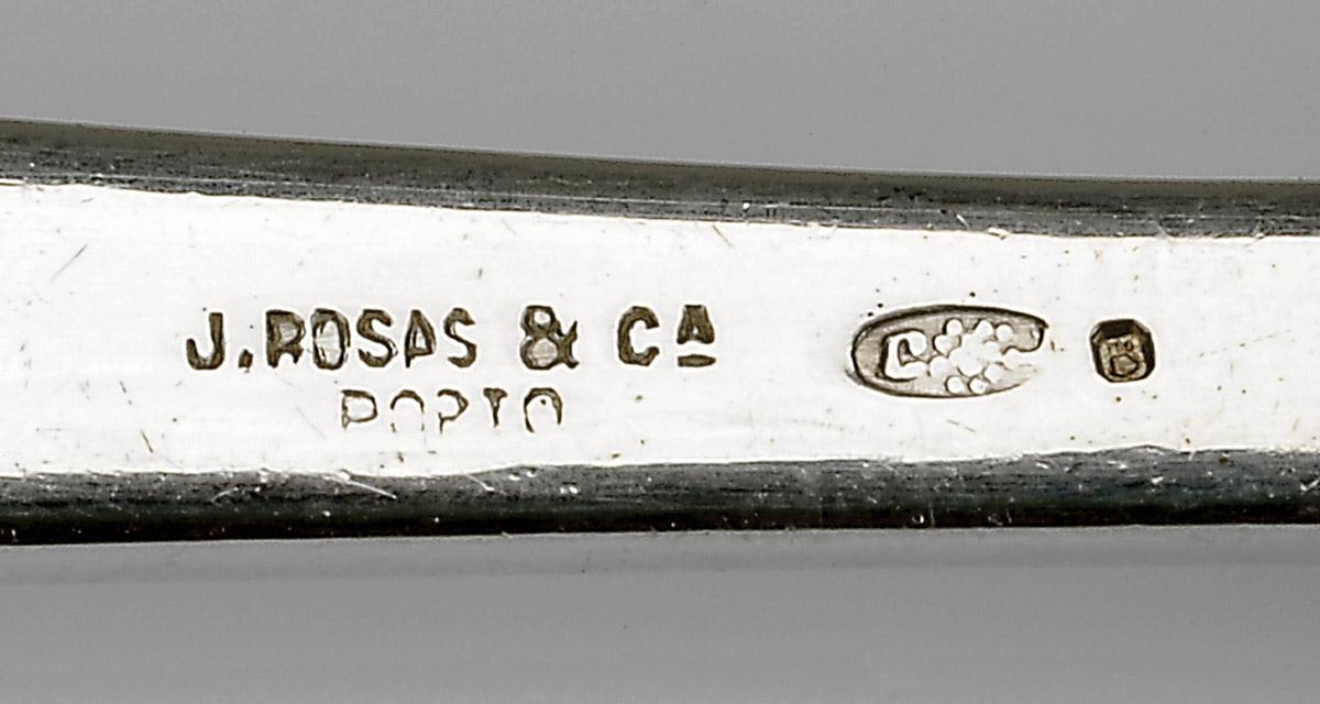composto por colheres de sopa, talheres de carne, de peixe e de sobremesa, contraste Águia do Porto (1938-1984), marcas de ourives de Ernesto Santos & Cª (1968-1984) e de José Lino da Rocha (1960-1988), marca da ourivesaria ROSAS & C.ª - PORTO