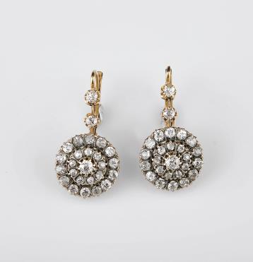 cravejados com 52 diamantes em talhe antigo de brilhante com o peso aproximado de 2,60 ct., contraste de Lisboa (1887-1937), marca de ourives de Carlos Joaquim Gomes (1914-1943)