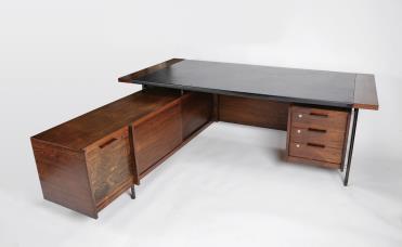 tampo forrado a pele negra, corpo lateral com gavetas