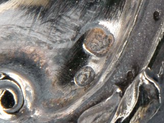 contraste Javali do Porto (1887-1937), marca do ourives António Caetano de Almeida (1894-1910), concha da mostardeira com marca de ensaiador de Lisboa (1770-1804), marca de ourives João Marques de Faria (1795-1822)