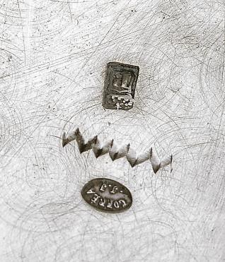 decoração guilhochada e gravada, marca de ensaiador do Porto (1877-1881), marca de ourives de José Joaquim Correia (1877-1887)