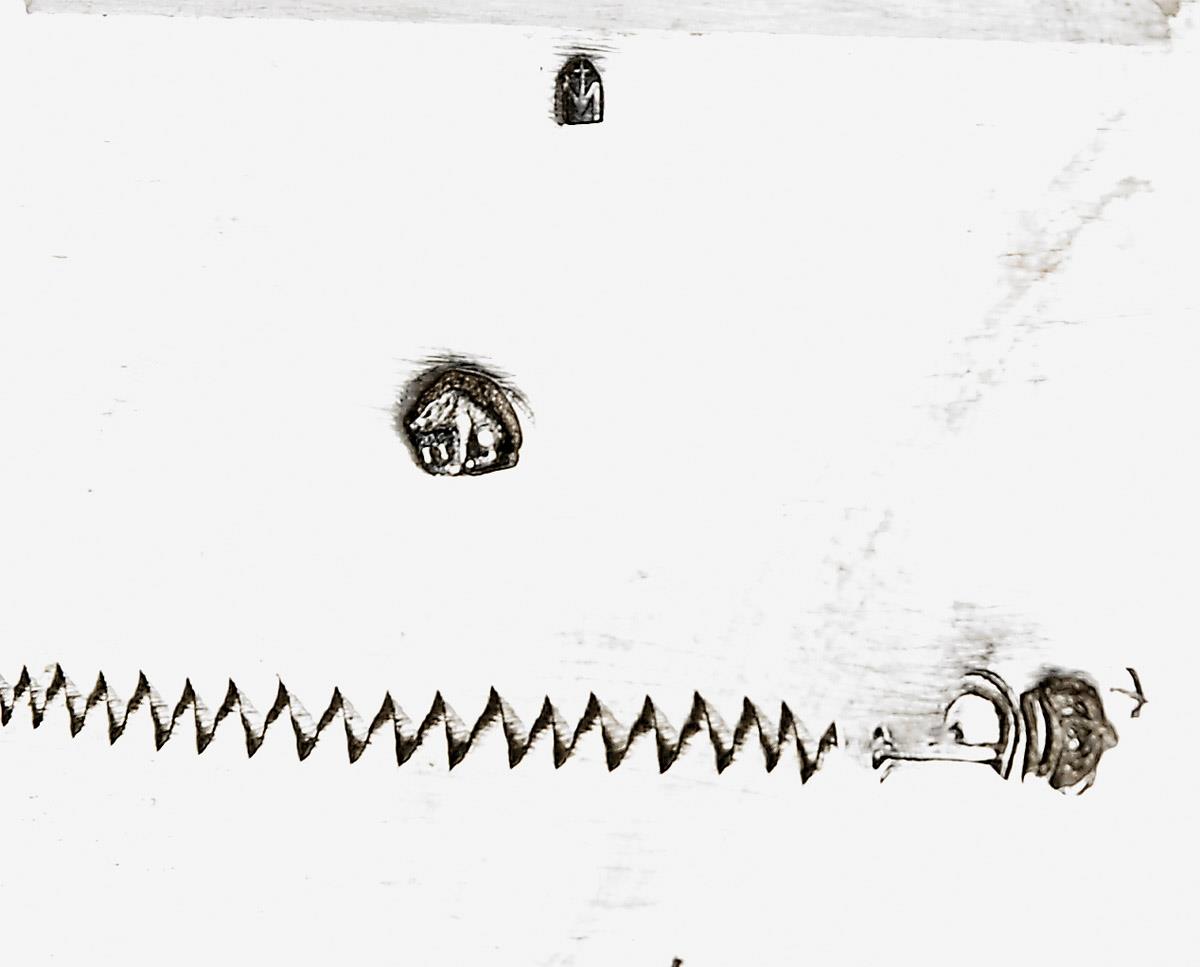 decoração relevada "Folhagens", decoração gravada com monograma coroado "S.M.", pseudo-contraste do Porto, remarcada com contraste Javali de Lisboa (1887-1937), marca de ourives de Manuel do Carmo Almeida (1924)