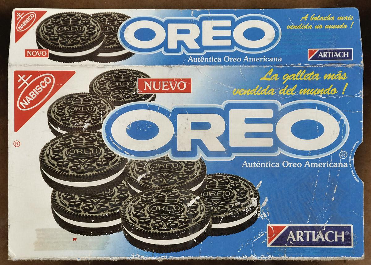 lápis sobre cartão de uma caixa de bolachas "Oreo"