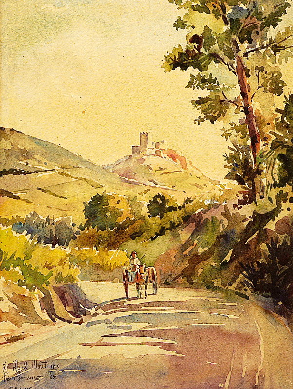 FÉLIX - SÉC. XX "Paisagem - Carroça e castelo" aguarela sobre papel assinada e dedicada Dimensões (altura x comprimento x largura) - 29 x 22,5 cm