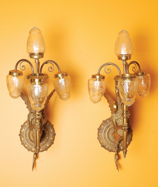 Par de apliques "Grifos" de quatro lumes cada bronze globos em vidro gravado franceses séc. XX (1ª metade) electrificados Dimensões (altura x comprimento x largura) - 95 cm