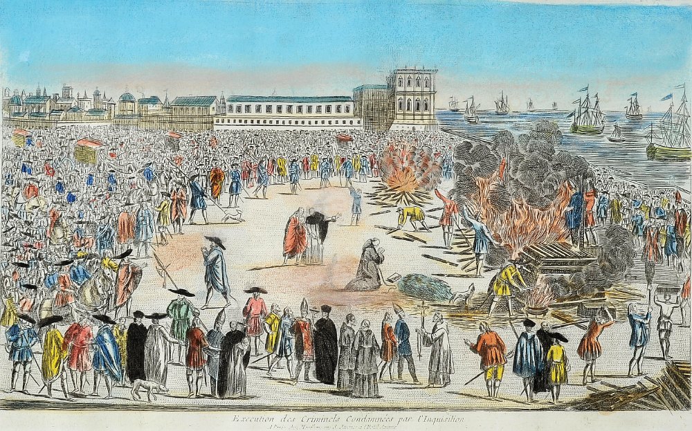 "Auto de fé no Terreiro do Paço - Lisboa" gravura aguarelada sobre papel francesa séc. XVII/XVIII Dimensões (altura x comprimento x largura) - 26 x 43 cm