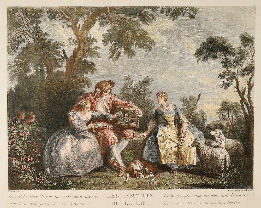 "Les Amours du Bocage" gravura colorida sobre papel francesa séc. XVIII Dimensões (altura x comprimento x largura) - 41 x 52 cm