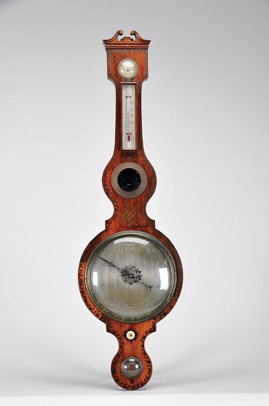 Barómetro de roda com termómetro, higrómetro e nível Jorge IV casquinha, mogno, latão e latão prateado pinturas a ouro simulando embutidos inglês séc. XIX (1ª metade) falta tubo de mercúrio, pequenos defeitos Dimensões (altura x comprimento x largura) - 105 cm