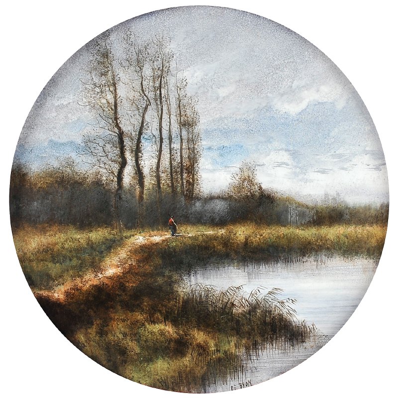 DE BYON - SÉC. XIX "Paisagem - Figura perto de lago" pintura sobre placa cerâmica de Sèvres moldura em veludo vermelho francesa séc. XIX (2ª metade) assinada Dimensões (altura x comprimento x largura) - 43 cm
