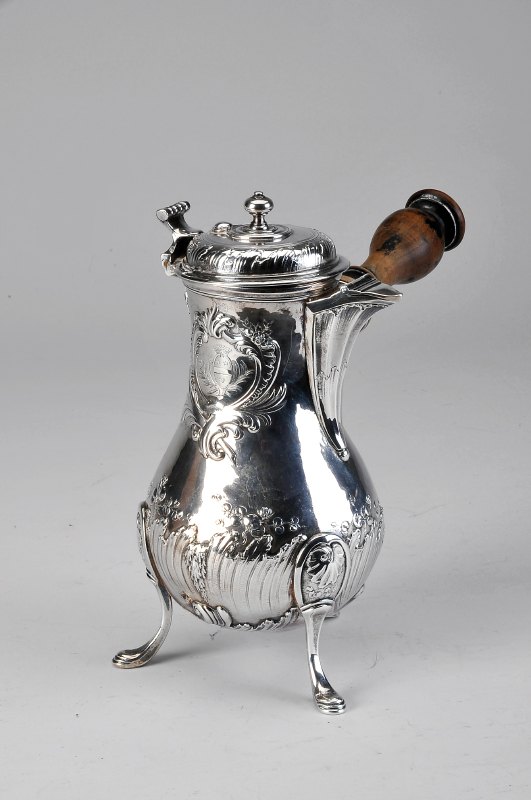 Chocolateira prata, punho em madeira torneada e pintada decoração gravada "Armas de família", marca de ensaiador de Paris (1762-1774), marca de ourives Joseph Bouillerot (1759) francesa séc. XVIII (2ª metade) amolgadela e tampa soldada Dimensões (altura x comprimento x largura) - 24 cm; Peso - 840 grs.