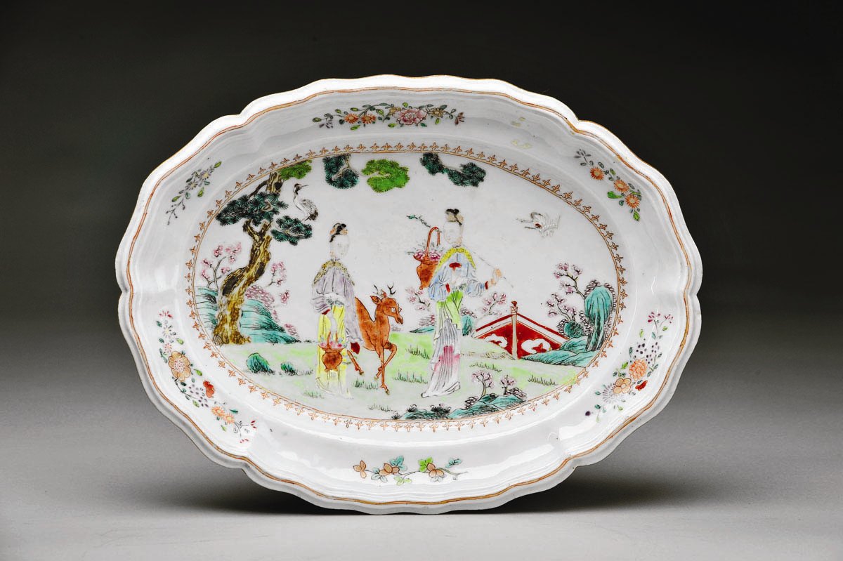 Travessa recortada de terrina porcelana da China, Companhia das Índias decoração policromada "Paisagem com figuras orientais e corça" reinado Qianlong (1736-1795) Dimensões (altura x comprimento x largura) - 39,5 x 30 cm