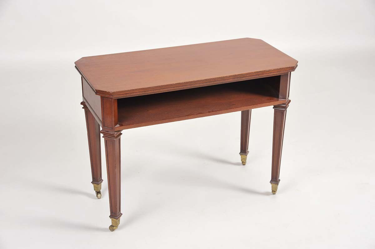 Mesa de apoio estilo Luís XVI mogno pés com rodízios portuguesa séc. XX pequenas faltas e defeitos Dimensões (altura x comprimento x largura) - 57 x 76 x 36 cm