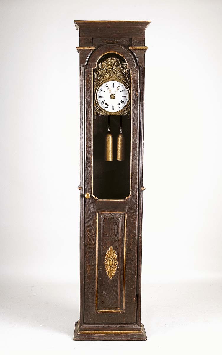 Relógio de caixa alta castanho com florão e frisos dourados mostrador em ferro esmaltado de branco e folha de Flandres dourada, decoração "Cena campestre", toca horas e repetição e meias-horas, despertador, autonomia de oito dias francês séc. XIX (finais) mecanismo a funcionar, pequenos defeitos Dimensões (altura x comprimento x largura) - 218 x 52 x 28,5 cm