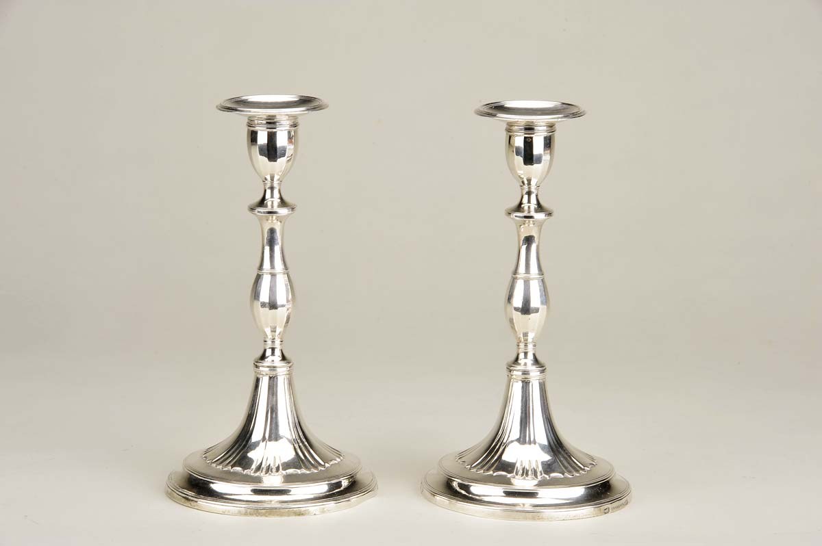 Par de castiçais neoclássicos prata marca de ensaiador do Porto (1810-1832), marca de ourives de António Moreira Rocha (1784-1810) (M. A. - P27 e P154) marca de posse EJ Dimensões (altura x comprimento x largura) - 22,5 cm; Peso - 741 grs.