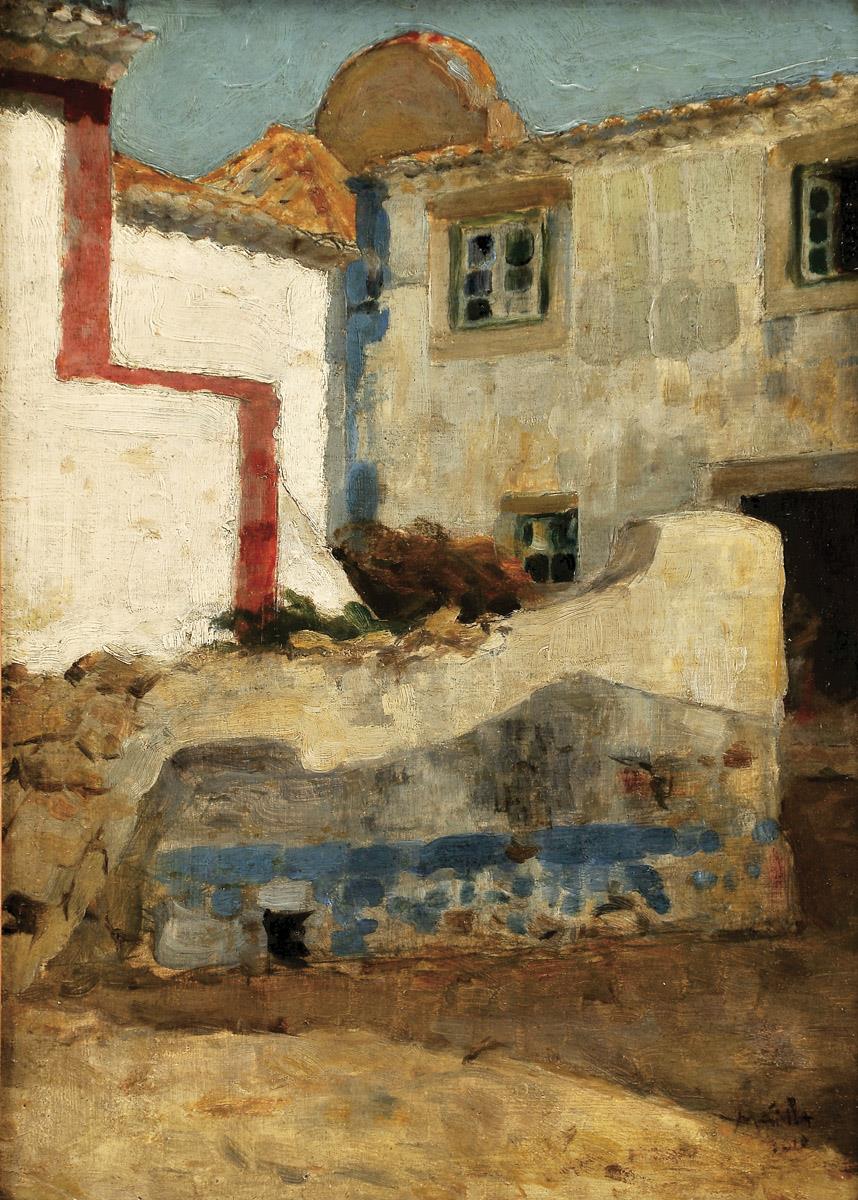 MAMIA ROQUE GAMEIRO - 1901-1996 "Trecho de Aldeia" óleo sobre cartão assinado e datado de 19?? Dimensões (altura x comprimento x largura) - 34 x 24,5 cm