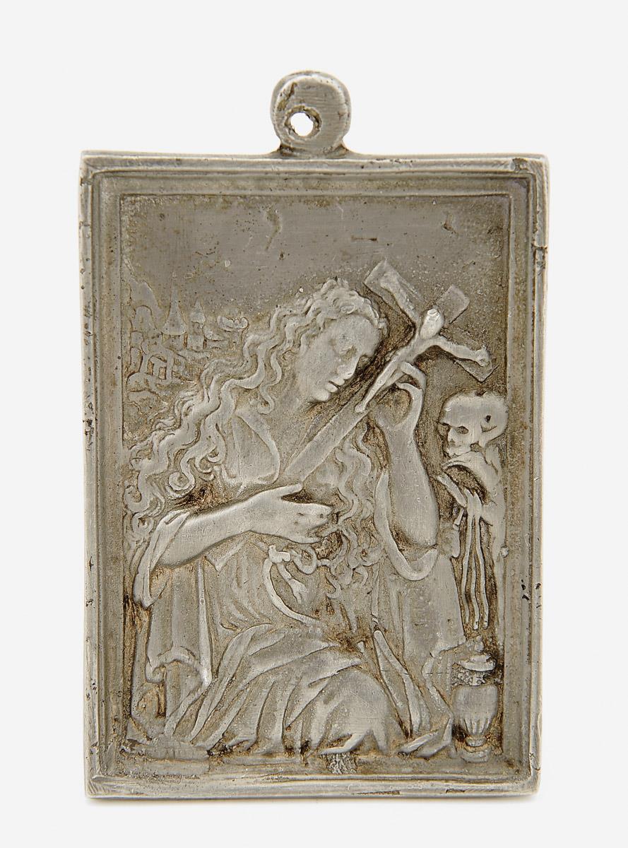 "Maria Magdalena", brass relief plaque, Iberian, 17th C., small defects Dimensões (altura x comprimento x largura) - 11 x 7 cm