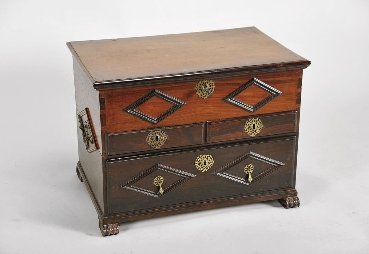 Arca de pequenas dimensões pau-santo e outras madeiras adaptação de elementos do séc. XVII portuguesa séc. XX pequenas faltas e defeitos Dimensões (altura x comprimento x largura) - 46 x 69 x 48 cm