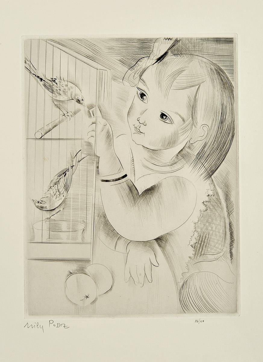 MILY POSSOZ - 1888-1968 Sem título (Menina junto de gaiola com pássaros) gravura sobre papel assinada e numerada 26/40, edição de Marcel Guiot - Paris Dimensões (altura x comprimento x largura) - 31 x 24 (chapa) cm