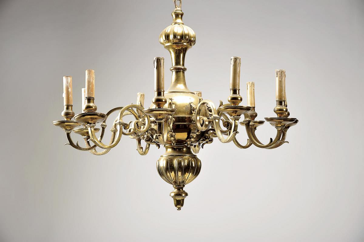 Lustre de 10 lumes estilo holandês metal amarelo português séc. XX pequenos defeitos Dimensões (altura x comprimento x largura) - 140 cm