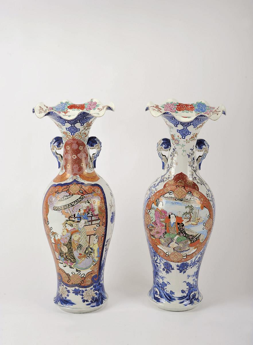 Par de jarrões porcelana do Japão decoração policromada e dourada "Flores" com reservas "Figuras orientais", pegas relevadas período Meiji (1868-1912) um com cabelo Dimensões (altura x comprimento x largura) - 92 cm