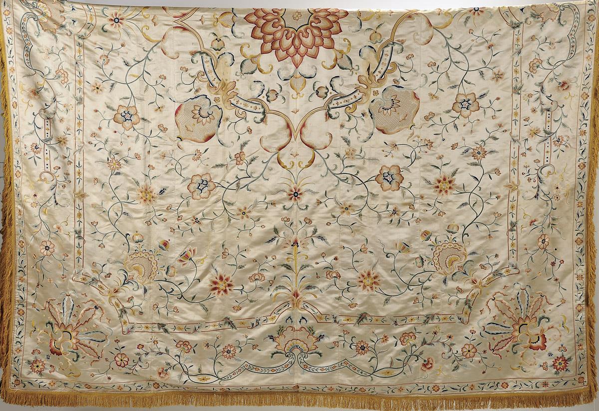 Colcha seda bordada a matiz decoração policromada "Flores" China séc. XIX rasgão e manchas Dimensões (altura x comprimento x largura) - 388 x 240 cm
