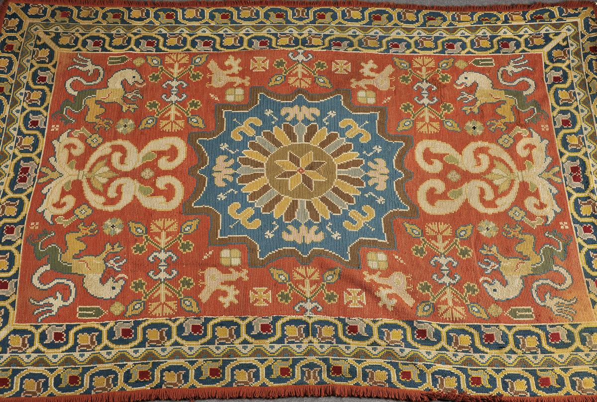 Tapete Arraiolos fio de lã decoração policromada "Leões e motivos geométricos" português séc. XX faltas e defeitos Dimensões (altura x comprimento x largura) - 294 x 195 cm