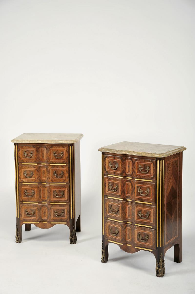 Par de mesas de cabeceira estilo Regência marchetaria de pau-santo, pau-rosa e pau-cetim aplicações em bronze, tampos de mármore francesas séc. XX pequenos defeitos Dimensões (altura x comprimento x largura) - 76 x 47 x 35 cm