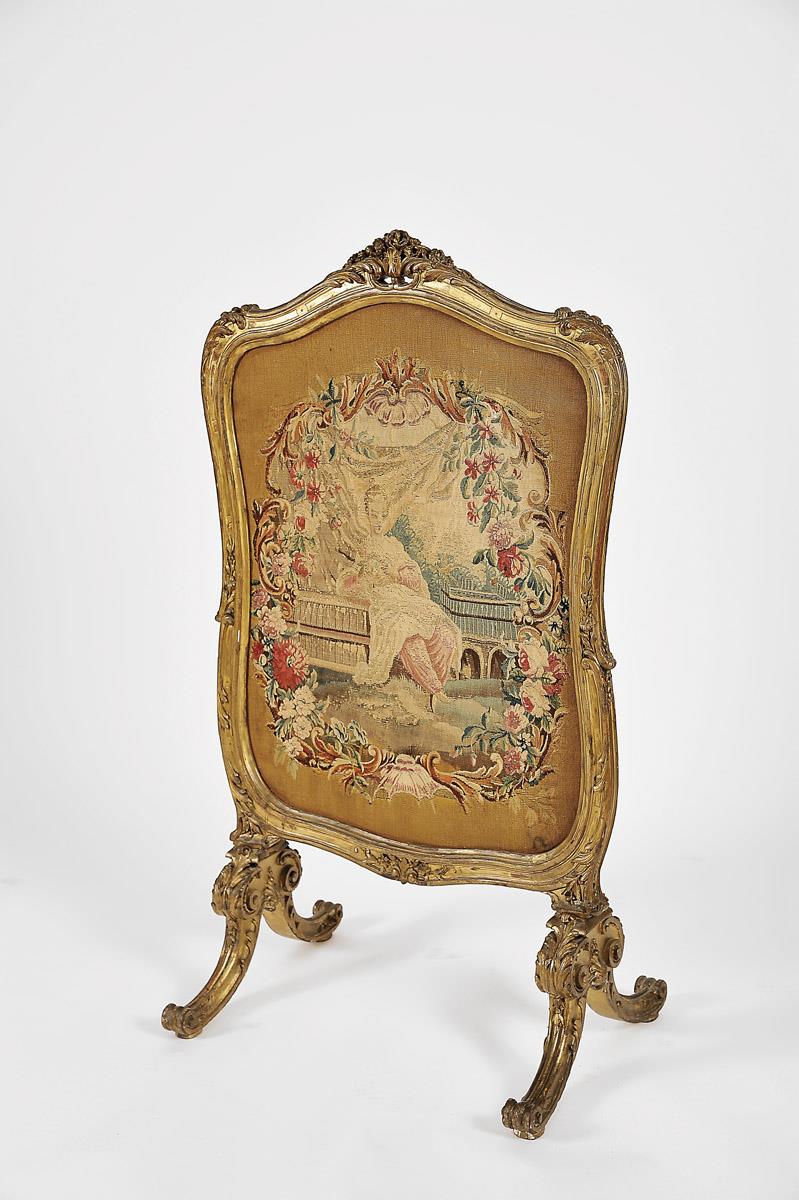 A Fireplace Screen, Louis XV (1723-1774), carved and gilt wood, tapestry upholstered front and lined back, French, faults to the gilt, defects on the lining Dimensões (altura x comprimento x largura) - 110 x 62 x 42 cm