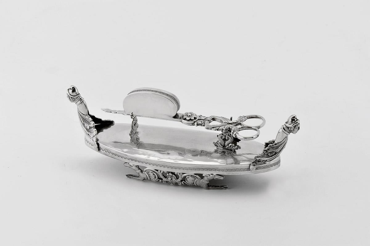 A Tray with Candle Snuffer, neoclassical, silver, relief decoration "Human figures", "Greyhounds" shaped feet, Barcelona hallmark, Narcís Rosell assay mark, unreadable maker's mark, Spanish, 19th C. (1st half) Dimensões (altura x comprimento x largura) - 15 (tesoura); 7,5 x 22,5 x 7 (bandeja) cm; Peso - 252 grs.