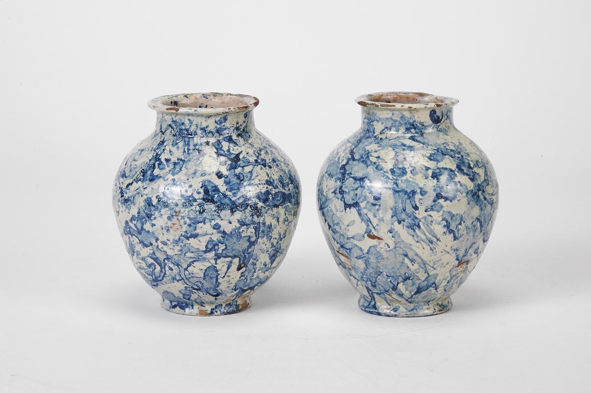 A Pair of Pots, faience, sponge blue decoration, 18th/19th C., chips Dimensões (altura x comprimento x largura) - 18 cm