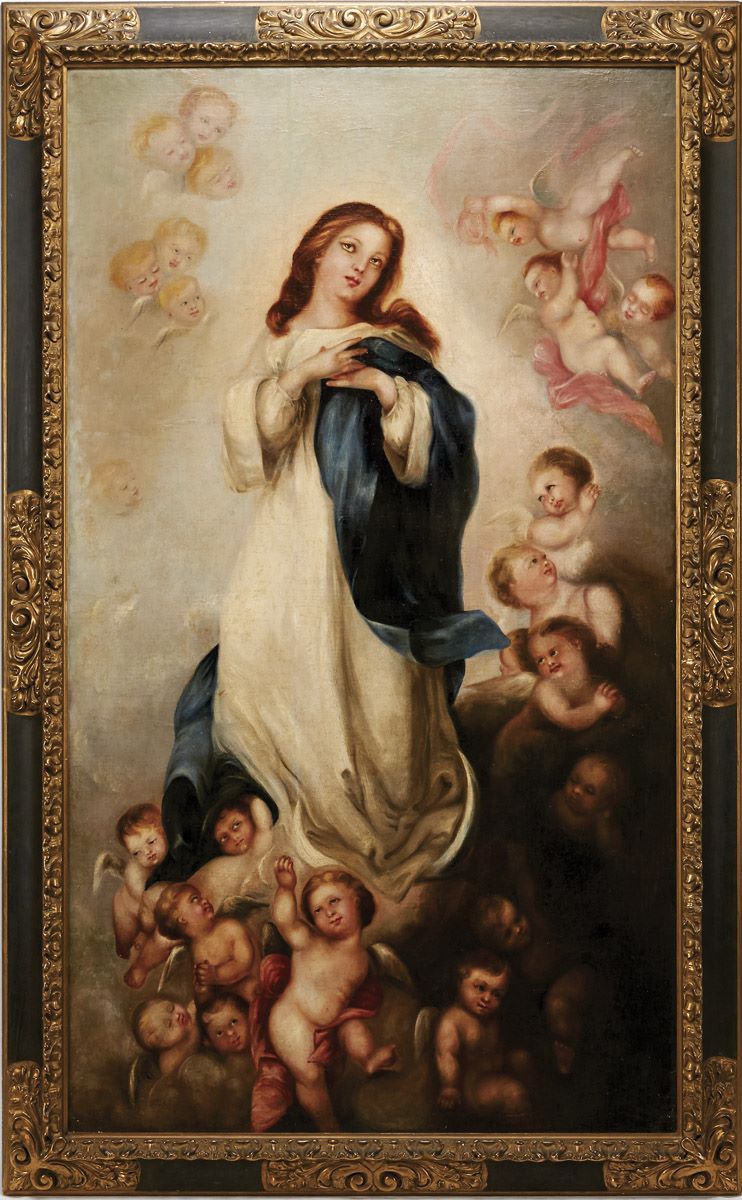 Our Lady of The Immaculate Conception of the Venerables, oil on canvas, Spanish school, 18th/19th C., relined, restorations Dimensões (altura x comprimento x largura) - 186 x 106 cm
