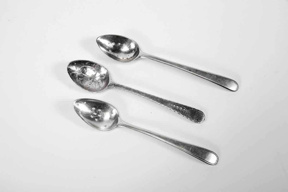 Three Mote Spoons, D. Maria I, Queen of Portugal (1777-1816), silver, pierced and engraved decoration “geometric motifs" and "Flowers", Portuguese, one spoon with bruises, Guimarães and Oporto assay marks (1853) and (1792-1803), IPM, Manuel de José Faria (1770-1807) and APC makers’ marks(1836-1853), remarked with "Cabeça de Velho" Dimensões (altura x comprimento x largura) - 12,5 cm; Peso - 49,1 g.