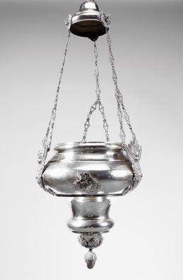 A Ceiling Lamp silver metal chains support "Cherubs" and "Sacred Heart of Mary" Portuguese 18th/19th C. signs of use Dimensões (altura x comprimento x largura) - 120 cm