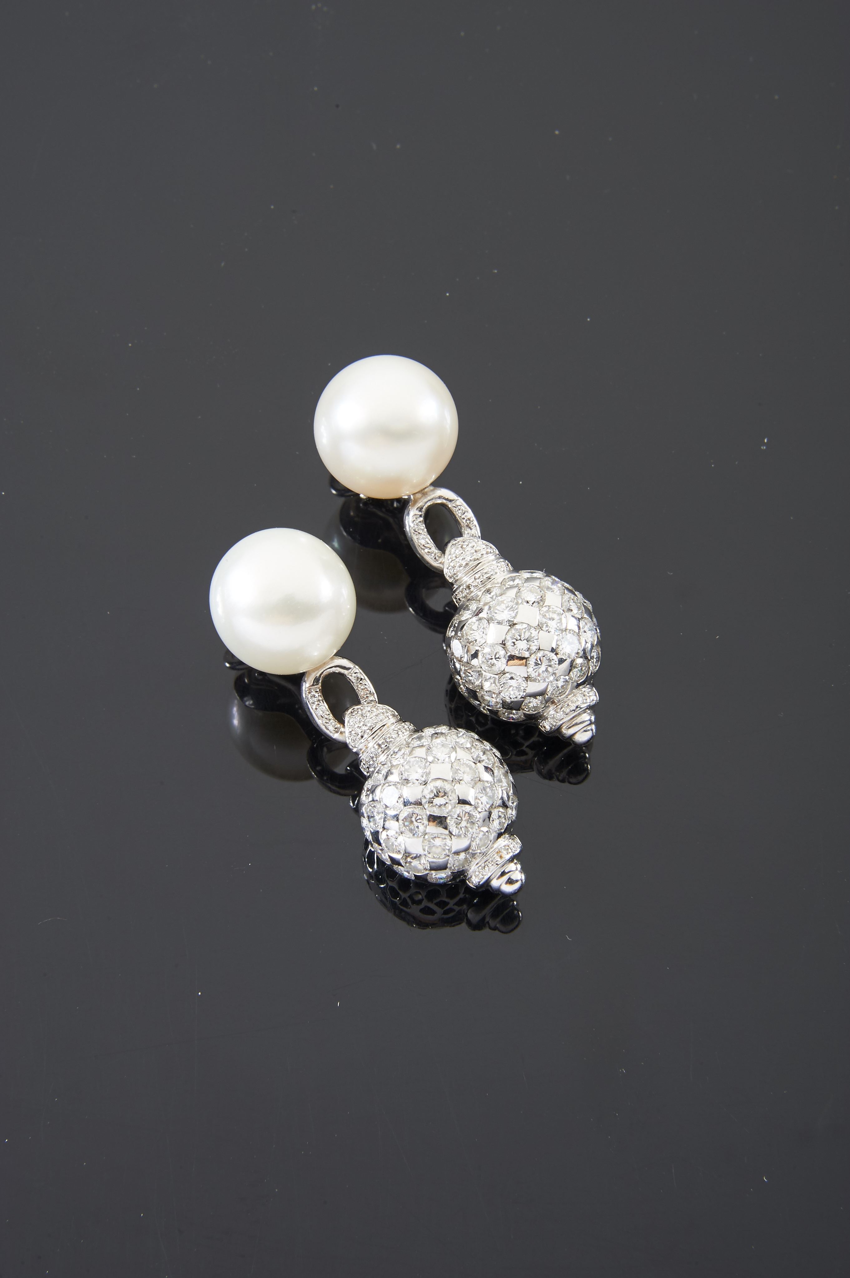 A Pair of Earrings 585/1000 gold set with 2 South Sea pearls (15m) and 62 brilliant cut diamonds with the approximate weight of 6 ct. Portuguese Lisbon mark (post 1985) Dimensões (altura x comprimento x largura) - 4,5 cm; Peso - 28 g.