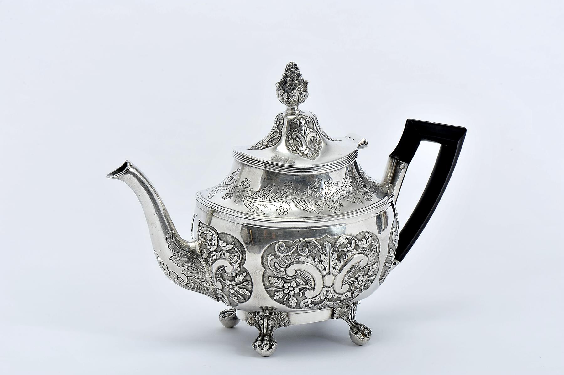 A Teapot romantic 833/1000 silver engraved decoration en relief Flowers", "claw and ball" feet, exotic wooden handle Portuguese Oporto assay mark (1818-1836), unidentified maker's mark, remarked «Cabeça de Velho» Dimensões (altura x comprimento x largura) - 22 cm; Peso - 1022 g.