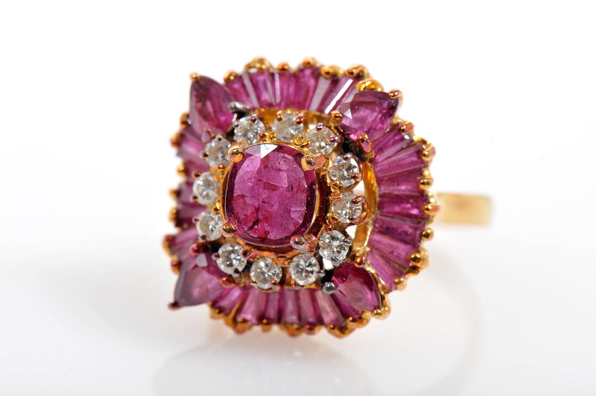 A Ring 750/1000 gold set with rubies and 12 brilliant cut diamonds with the approximate weight of 0.36 Ct. Belgian 20th C. signs of use warranty mark Dimensões (altura x comprimento x largura) - 14 (17 mm) cm; Peso - 8,8 g.