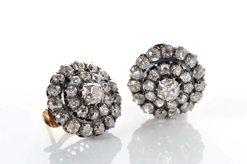A pair of earrings gold and silver set with 52 antique brilliant cut diamonds weighing approximately 6.40 ct. Portuguese 20th C. (mid) signs of use without marks, pursuant to Decreto-Lei 120/2017, of 15 September - art. 2, paragraph 2, subparagraph c) Dimensões (altura x comprimento x largura) - 2 cm; Peso - 11,7 g.